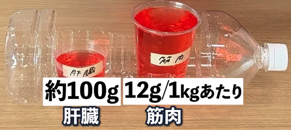 肝臓は約100g、筋肉はその人の筋肉量によって
