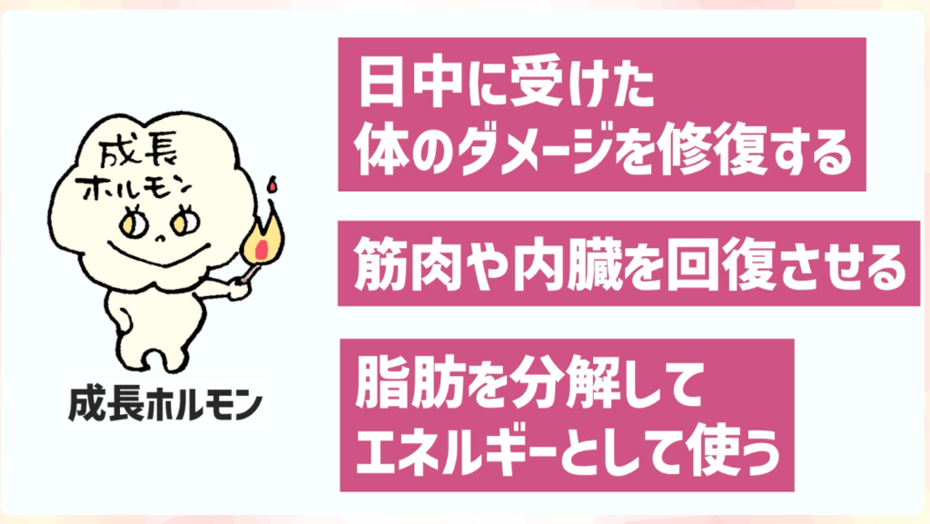 まず、睡眠中には成長ホルモンというホルモンが